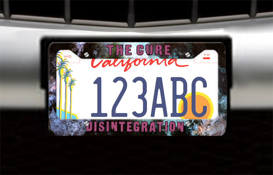 The Cure "Disintegration" cover art on an aluminum license plate frame. Dimensions are 6.46" x 12.21" x .030"